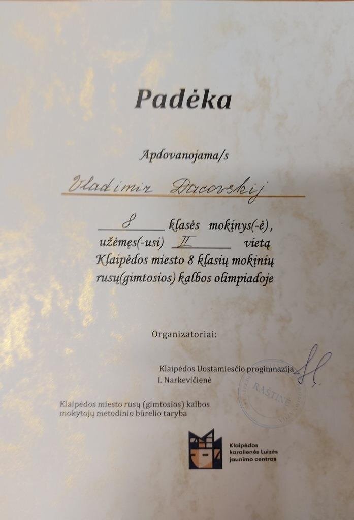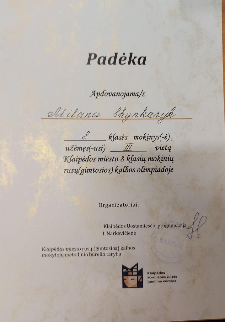 Š. 2026 m. vasario 11 d. mūsų mokykloje vyko miesto 8 klasių mokinių rusų kalbos ir literatūros (gimtosios) olimpiada. Su prizinėmis vietomis sveikiname mūsų progimnazijos mokinius: II vieta – Vladimir Dacovskij, III vieta – Emilija Pupkutė, III vieta – Milana Shynkaryk. Dėkojame mokytojai Yanai Bieliakovai.