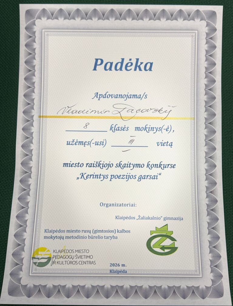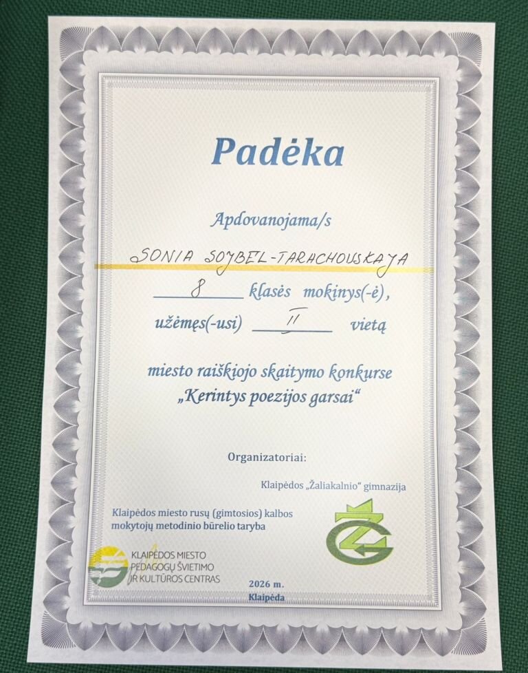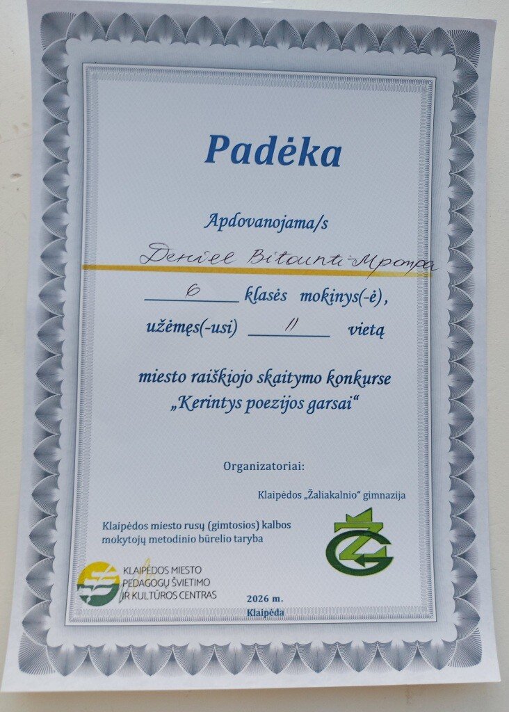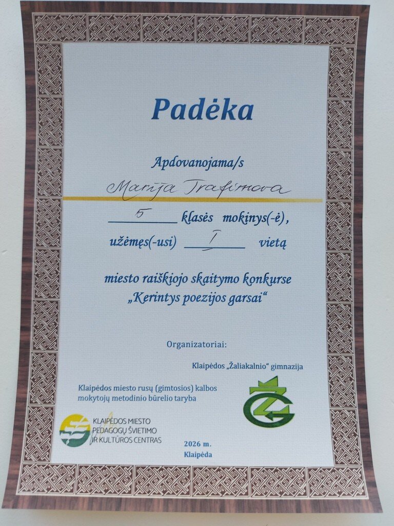 Klaipėdos miesto meninio skaitymo konkursas ,,Užburiantys poezijos garsai“ ivyko 2026 m. kovo 13 d., ir mūsų progimnazijos mokiniai jame pasirodė puikiai! Visi mūsų mokyklos dalyviai deklamavo nepamirštamai ir 5-6 klasių grupėje laimėjo I-ąją vietą – Marija Trofimova (5a klasė), mokytoja Larisa Draganova, II-ąją vietą – Daniel Bitounti-Mpompa (6c klasė), mokytoja Olga Drobysh.