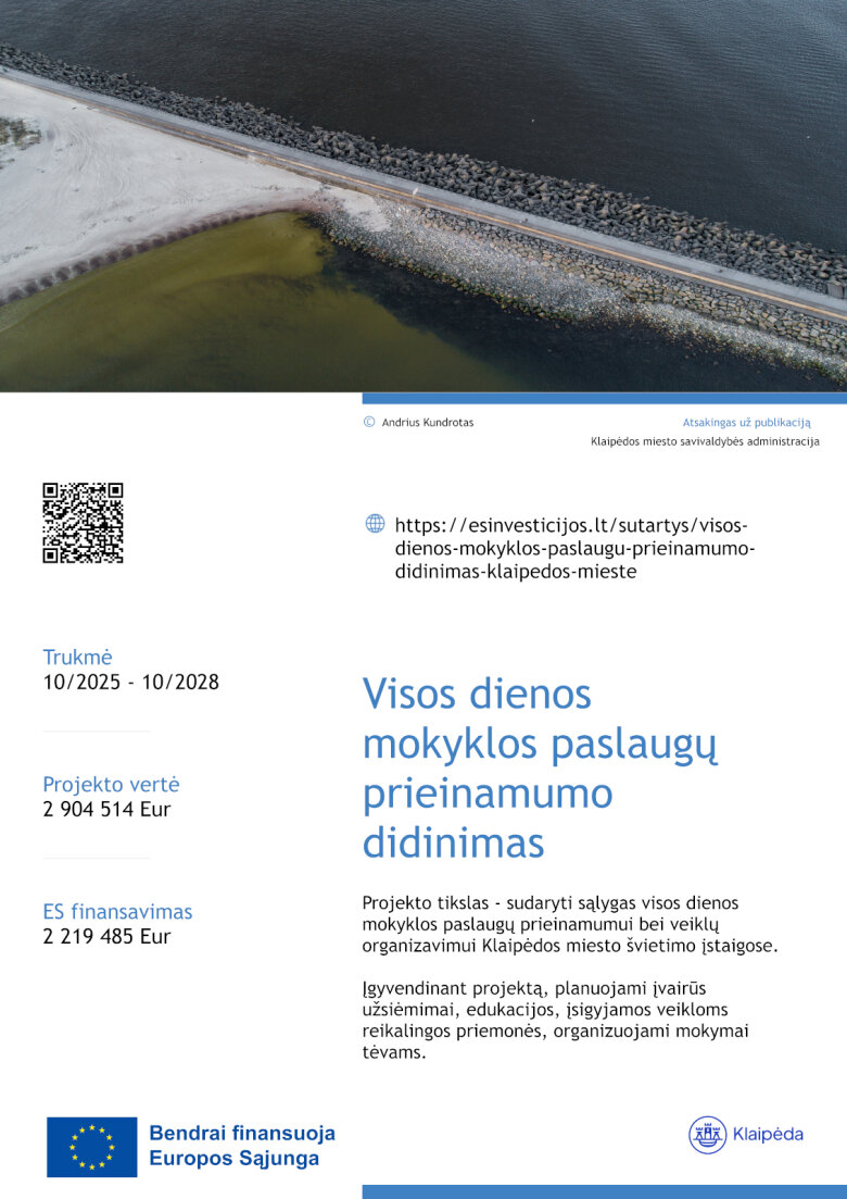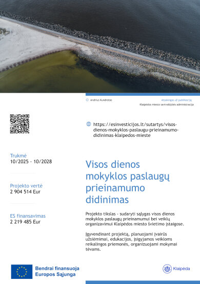 Projektas įgyvendinamas pagal jungtinę iniciatyvą „Visos dienos mokyklos paslaugų prieinamumo didinimas Klaipėdos mieste“, Nr. 10-059-K-0017, ir yra bendrai finansuojamas Europos Sąjunga lėšomis.